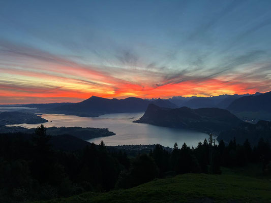 Als wir in Fräkmüntegg ankamen, bot sich uns ein grossartiger Blick auf den Pilatus. Gleichzeitig lag uns der Vierwaldstättersee in seiner ganzen Schönheit zu Füssen. Nach einer Pause machten wir uns auf den Weg zur letzten Etappe des Samstags, dem Berghotel Alpgschwänd.