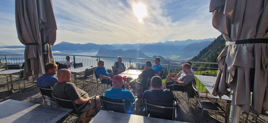 Am Sonntagmorgen genossen wir von der Terrasse den Blick auf den Vierwaldstättersee und einen wolkenlosen Himmel. Nach dem Frühstück ging es bergab Richtung Hergiswil. Nach rund eineinhalb Stunden erreichten wir unser Ziel, die Rösslibar am See.