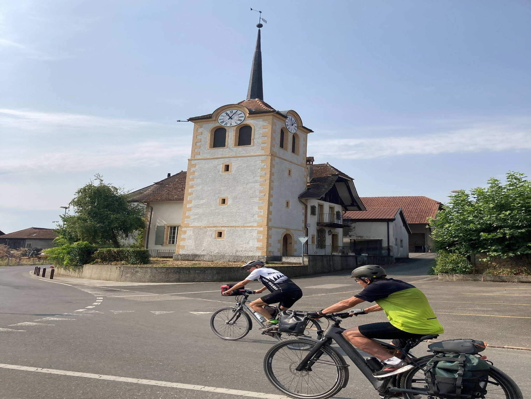 Entlang der Aare ging es weiter nach Büren an der Aare, stets beobachtet von Störchen und sogar ein Fuchs bestaunte unsere Fahrkünste. In Lyss wurde das Mittagessen für das Picknick eingekauft, bevor es entlang des Hagneck-Kanals nach Aarberg weiterging. Unterwegs konnten wir sogar Pannenhilfe leisten. Zurück blieben dankbare Radler und eine Velopumpe. Die Strecke führte durch ausgedehnte Gemüsekulturen bis zum Murtensee, wo ein erster wohlverdienter Zwischenhalt eingelegt wurde. Von Praz war es nicht mehr weit bis zum Tagesziel Avenches Plage. Nach 106 Kilometern erreichten wir unsere Unterkunft Lacotel. Der vorhandene Swimmingpool sorgte für ein ideales Herunterfahren und das gemeinsame Nachtessen liess alle Strapazen vergessen.